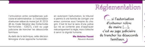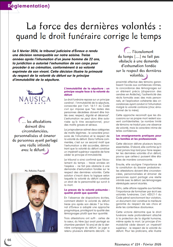 Droit funéraire, Le cabinet dans les médias, Publications Me Fouret évoque la force des dernières volontés dans Résonance Funéraire 4 mars 2026 | par Antoine Fouret Me Antoine Fouret a eu l'occasion de s'exprimer au sein de Résonance Funéraire sur la force légale des dernières volontés en droit funéraire. Retrouvez son article ci-dessous. Antoine Fouret, dernières volontés, droit funéraire, exhumation, média