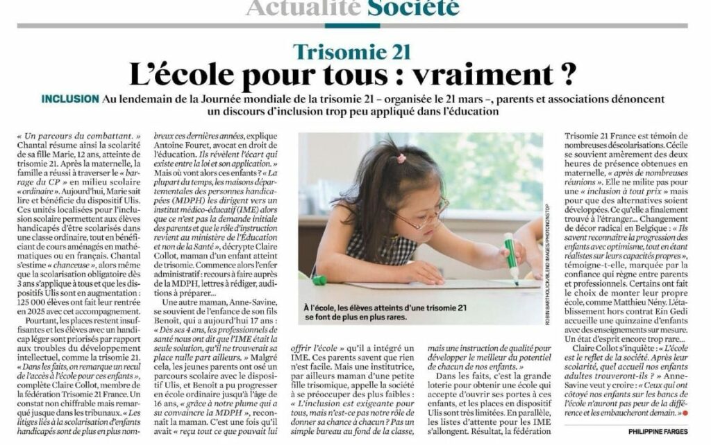 A l’occasion d’un article de fond du JDD sur l’état de la scolarisation des enfants atteints de trisomie 21, le journal a interrogé Me Fouret afin de faire un point sur la situation de ces enfants au regard des objectifs d’inclusivité prévue par la loi en matière de scolarisation.